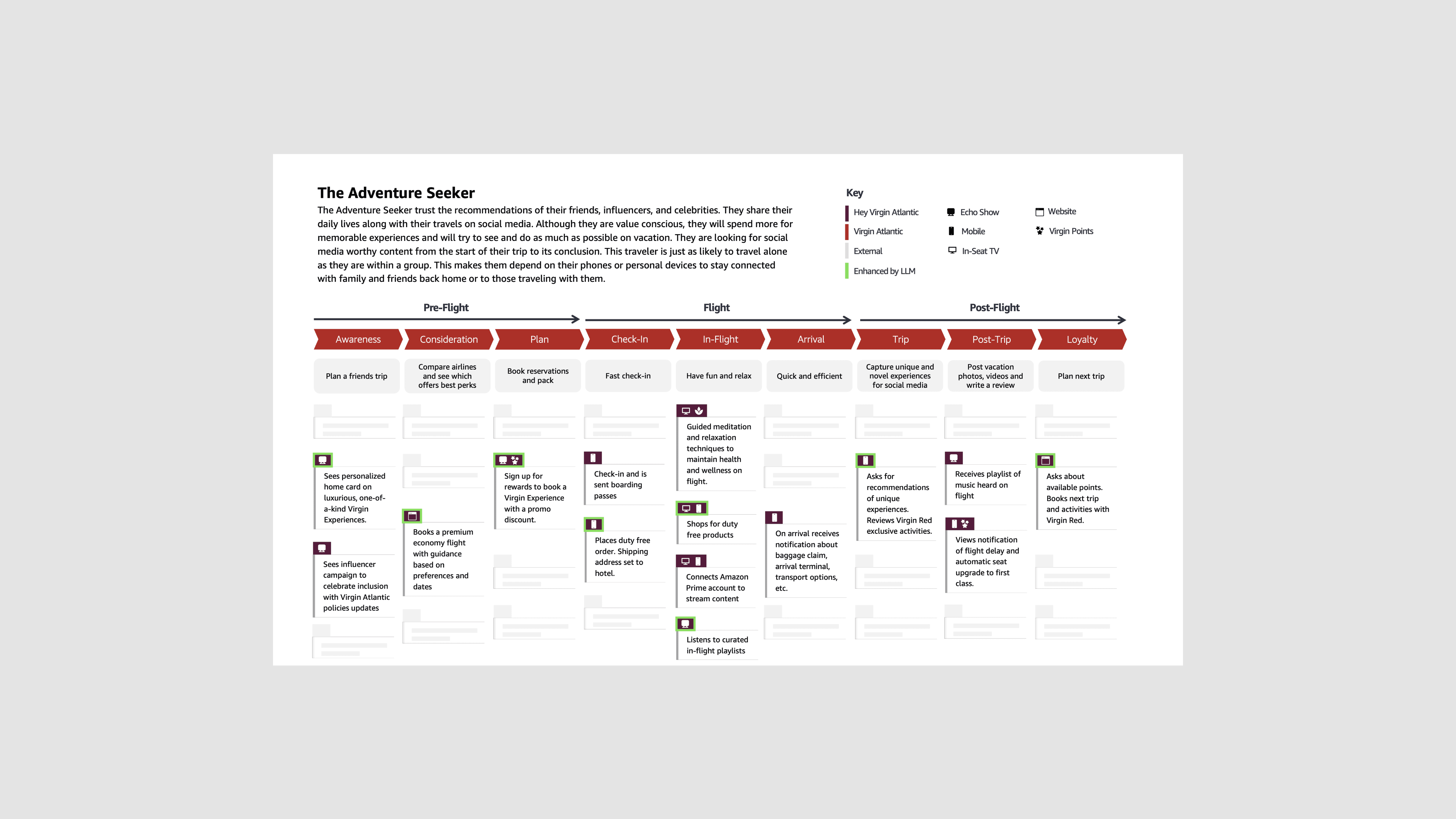 To help leaders truly understand the experience, I defined how Amelia should speak, act, and respond. This meant crafting the core scripts, example dialogs, emotional cues, and interaction patterns that established her character and guided the entire product team. I then designed expressive, high-fidelity interactions and worked with Virgin executives to shape cinematic storytelling that showed Amelia supporting travelers from inspiration to boarding. This work played a key role in securing Virgin Atlantic as a new partner for the Alexa Enterprise business.