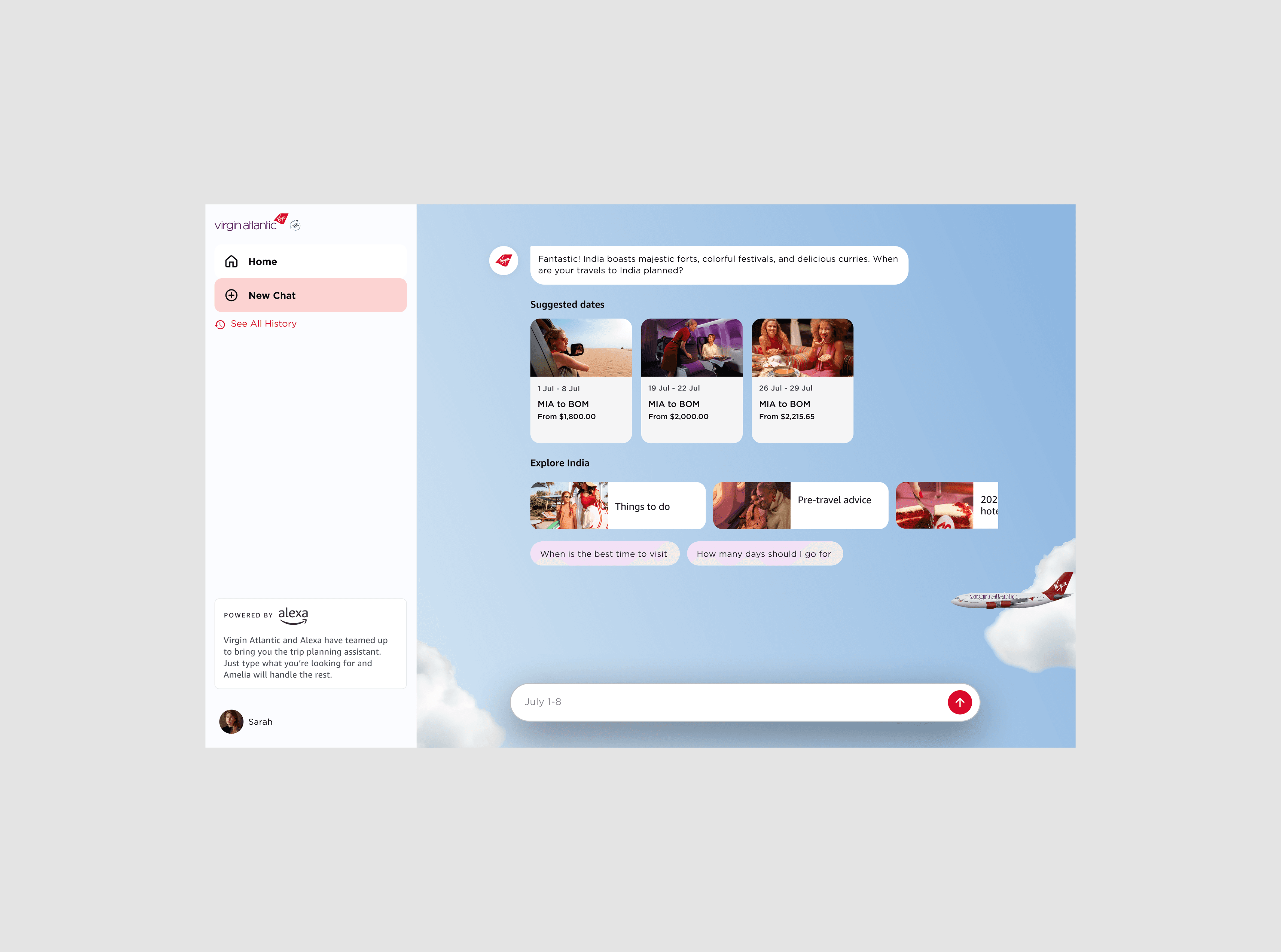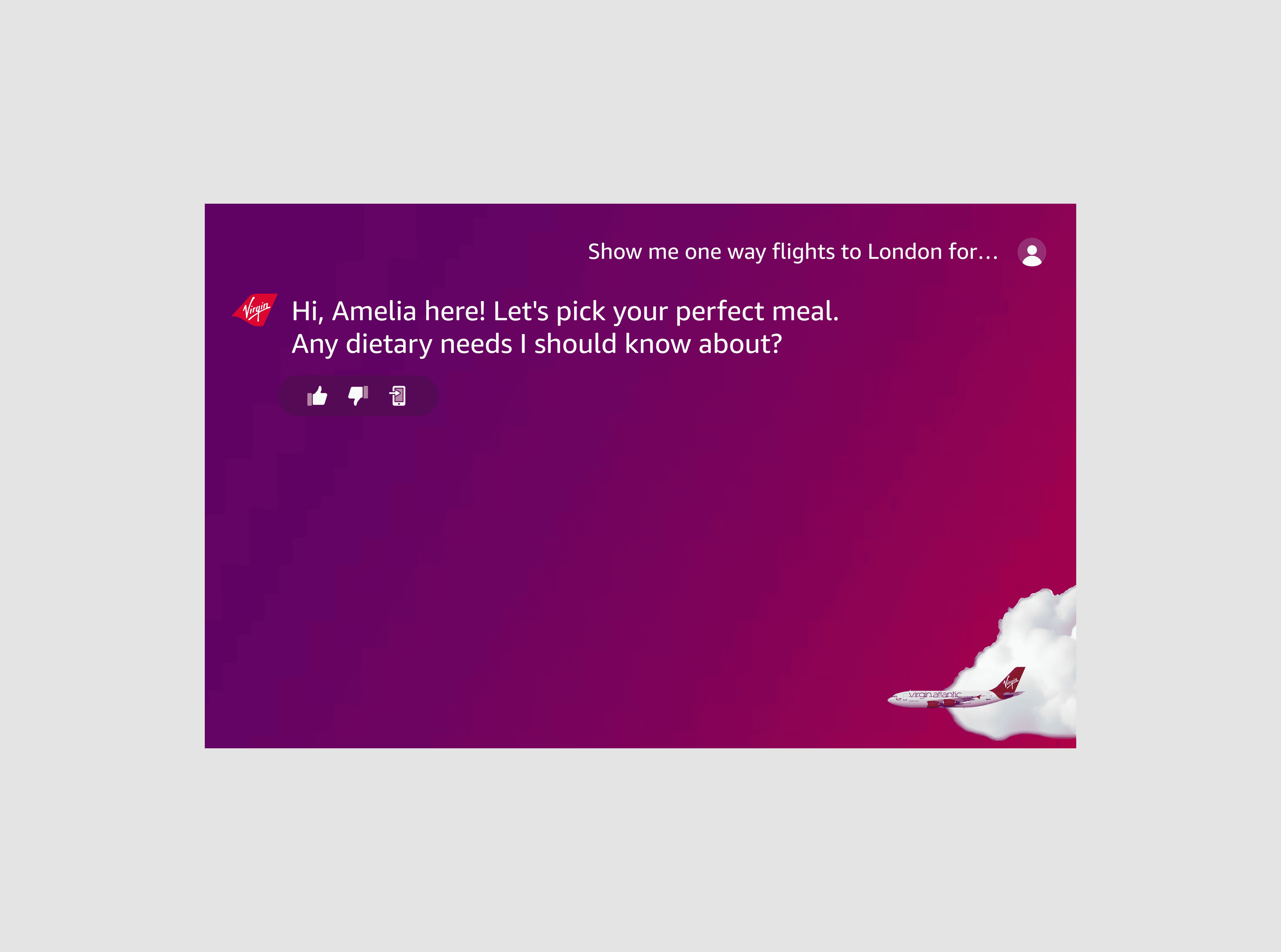 Virgin Atlantic wanted to create a travel companion that felt warm, personal, and unmistakably theirs, and I was brought in to help bring that vision to life. I created the airline’s AI persona, later named Amelia, shaping her personality, voice, dialog flow, and multimodal interface across web, mobile, and at-home Alexa experiences.